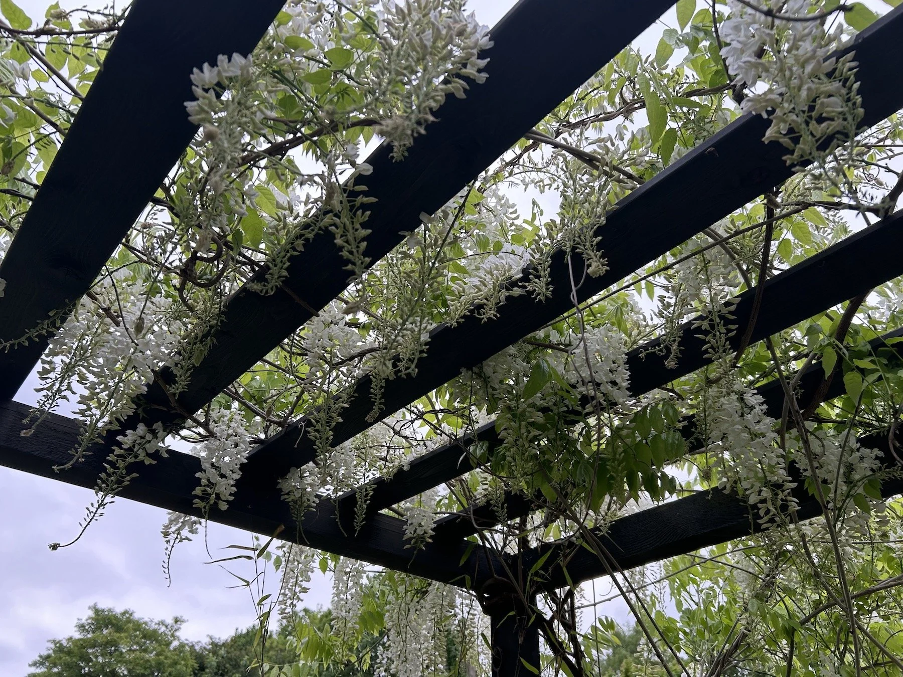 The wider roof slat spacing for this pergola was chosen to allow for training white wisteria across the entire pergola roof to soften the overall look and to gradually increase the level of shading over time, as shown below.