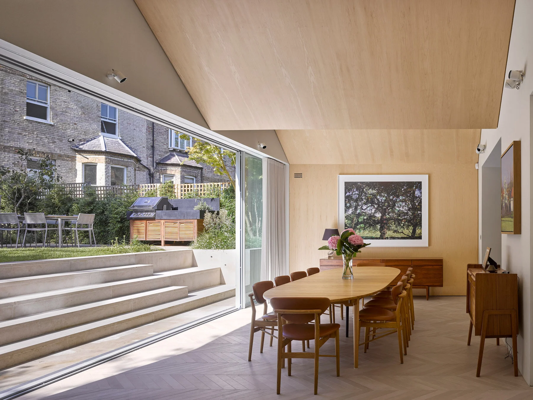 For me, the highlight of this lovely renovation of Hampstead House by Dominic McKenzie Architects is the new extension, as shown here, to create a larger open plan lounge and dining room space.